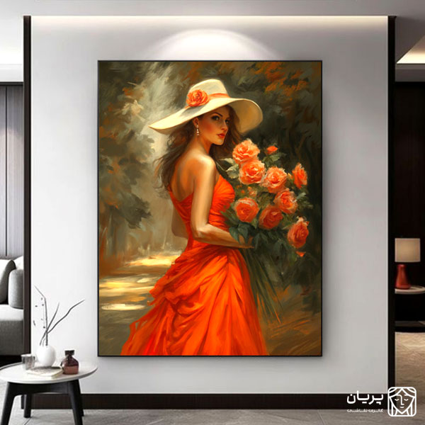 در پیچ و خم جاده ای که به باغی از رویاها می رسد، زنی با وقار و پر از طراوت، در اوج شکوه نارنجی، نمایان شده است. این اثر هنری، رقص نور و رنگ را در آغوش میکشد و با ظرافت بی نظیری، شور و نشاط زندگی را به تصویر میکشد. او در حال حمل دسته ای از گل های نارنجی، نمادی از عشق، اشتیاق و زیبایی بی پایان است. این تابلو نقاشی، دعوتی است به تجربه لحظه ای از آرامش و شور، که هر نگاهی را به عمق داستان های پنهان خود میکشاند. اثری که نه تنها دیوارها را می آراید، بلکه روح فضا را با احساسات گرم و دلنشین پر میکند.