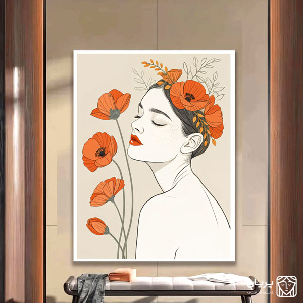 این تابلو نقاشی یک زن رو نشون میده که با چشمای بسته و لبخند آروم، انگار تو آرامش کامل به سر میبره. گلهای نارنجی که دور سرش مثل تاجی زیبا قرار دارن، حس یکپارچگی با طبیعت رو میدن. خطوط نرم شونه هاش و برگهای سبز کنار گلها، مثل یه منظره طبیعی و ساکت به نظر میرسه. این تابلو نقاشی، داستان یه صبح بهاری رو میگه، یک تصویر پر از آرامش و زیباییه که با هر نگاه، آدم رو به دنیای طبیعت و حس خوبش میبره.
