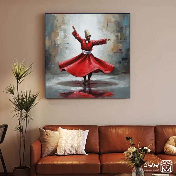 این تابلو نقاشی رقص سماع ، با ضربات قلمی آزاد و رنگ هایی پر از حس، به تماشاگر اجازه میدهد تا خود را در میانه یک لحظه شورانگیز و عرفانی از رقص سماع بیابد. شخصیت مرکزی با لباسی قرمز که به زیبایی در چرخش است، نمادی از رهایی و غوطه وری در جریان هستی را به نمایش می گذارد. فضا پسزمینه، با بافت های خاکستری و تیره، بر عمق و خلوص این حرکت مقدس تأکید میکند و نورپردازی درخشان، گویی از درون، این چرخش را به سوی روشنایی و معنویت هدایت می کند. این تابلو نقاشی نه تنها یک تصویر، بلکه دعوتی است به تأمل در هماهنگی روح و بدن، و سفری درونی به سوی آرامش و وصل.