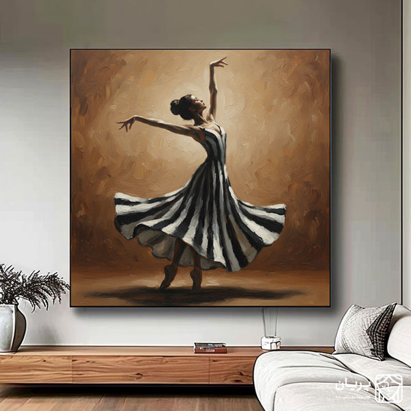 تابلو نقاشی رویای بالرین، تجلی شور و زیبایی در اوج حرکت است. بالرین با لباس راه راه سیاه و سفید، گویی در آغوش باد به پرواز درآمده و هر خط و هر چرخش بدنش، روایتی از ظرافت را به تصویر می‌ کشد. نور ملایمی که از پشت بر پیکر او می‌تابد، به حرکتش عمق و حس و حال بخشیده و بیننده را به تماشای اوج یک لحظه ناب از هنر و زندگی دعوت می‌کند. این تابلو نقاشی، داستانی از رهایی و بیان احساسات از طریق حرکت است.