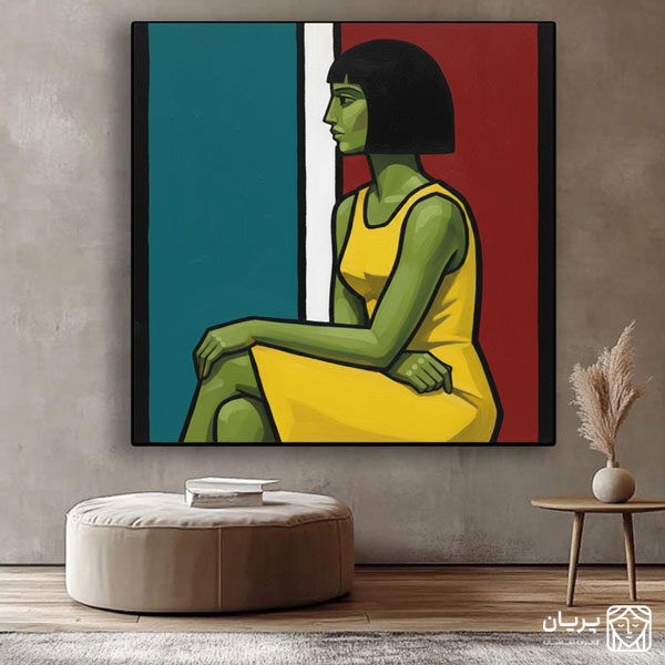 تابلو نقاشی آرامش رنگین تصویری از یک زن رو نشون میده با پوست سبزه و لباس زرد، که آروم نشسته. موهای کوتاه سیاهش و زمینه آبی و قرمز، حس یه دنیای رنگارنگ و ساکتو میده. انگار تو فکرای خودش غرق شده. و رنگ ها، داستان یه لحظه پر از آرامش و ارتباط با طبیعت رو روایت میکنن.
