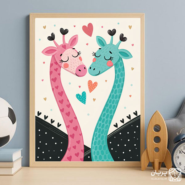 این تابلو روایتی از دو زرافه عاشق است که با گردن های دراز و قلبهای پر از مهر، نگاهشان به هم گره خورده است. یک اثر هنری دلنشین که با رنگهای شاد و نمادهای عاشقانه، حس آرامش و دوست داشتن را به خانه شما میآورد.